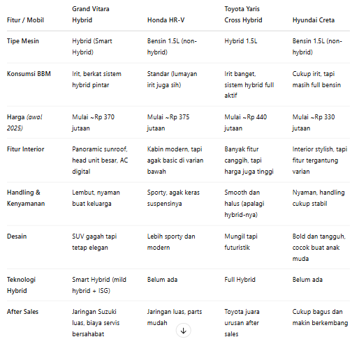 Kalau nyari mobil yang irit, nyaman, tampil gaya, plus teknologi kekinian, Grand Vitara Hybrid itu super worth it. Apalagi buat kamu yang peduli lingkungan tapi tetap pengen gaya dan performa.